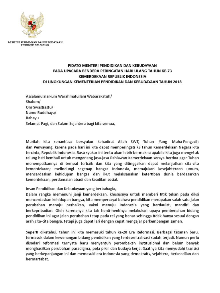 Https Www Kemdikbud Go Id Main Blog 2018 08 Pidato Menteri Pendidikan Dan Kebudayaan Pada Upacara Bendera Peringatan Hari Ulang Tahun Ke73