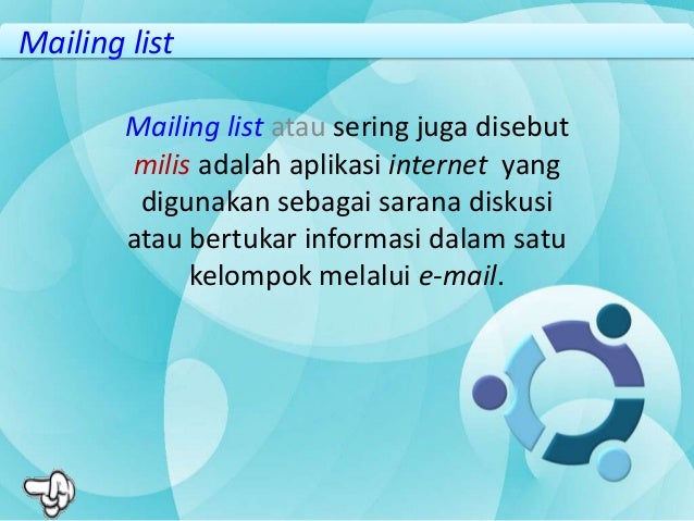 Milis Mailing List Adalah aplikasi internet yang digunakan sebagai sarana diskusi atau bertukar informasi.